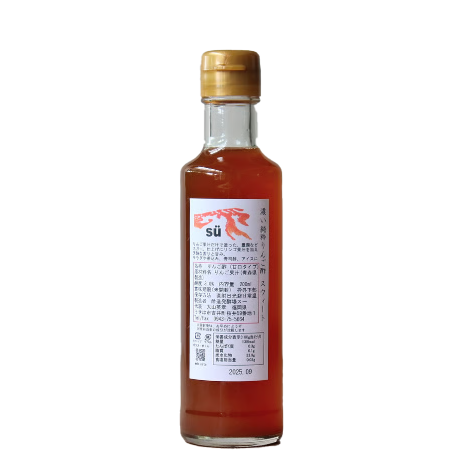 贅沢な100%りんご果汁使用の濃い純粋りんご酢。3倍のりんご量!香りと甘さ凝縮。サラダ、ポーク、デザートに。200ml、酸度3.0%。2年賞味期限。